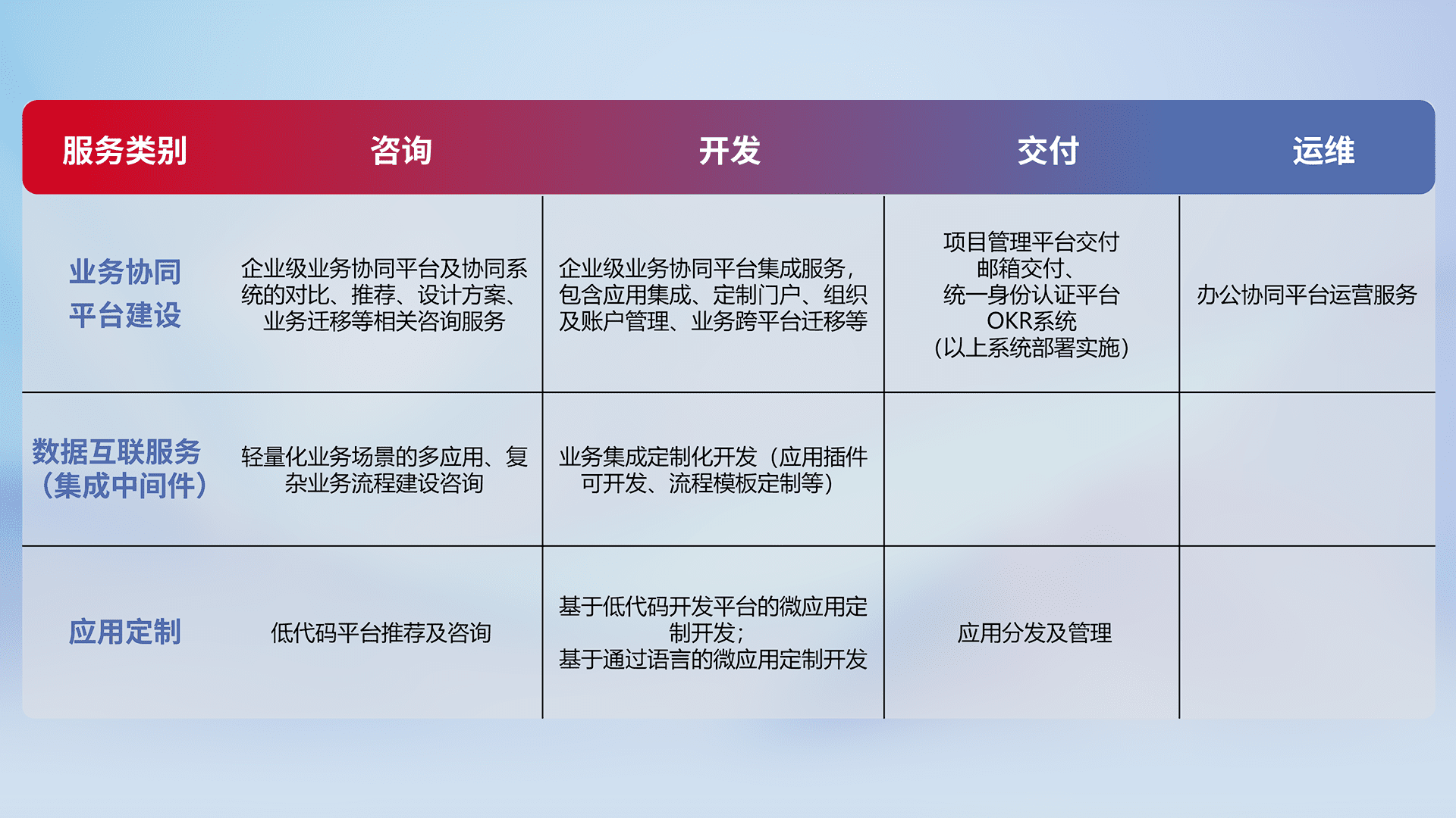 针对钉钉、、、、企微、、、IDaas等平台级产品提供产品的规划、、、、方案、、、、交付、、定制化开发等服务,,,实现如统一协同办公、、智能客户服务、、混合会议管理、、、智能数据查询、、、、等业务场景,,,实现数字化转型。。。